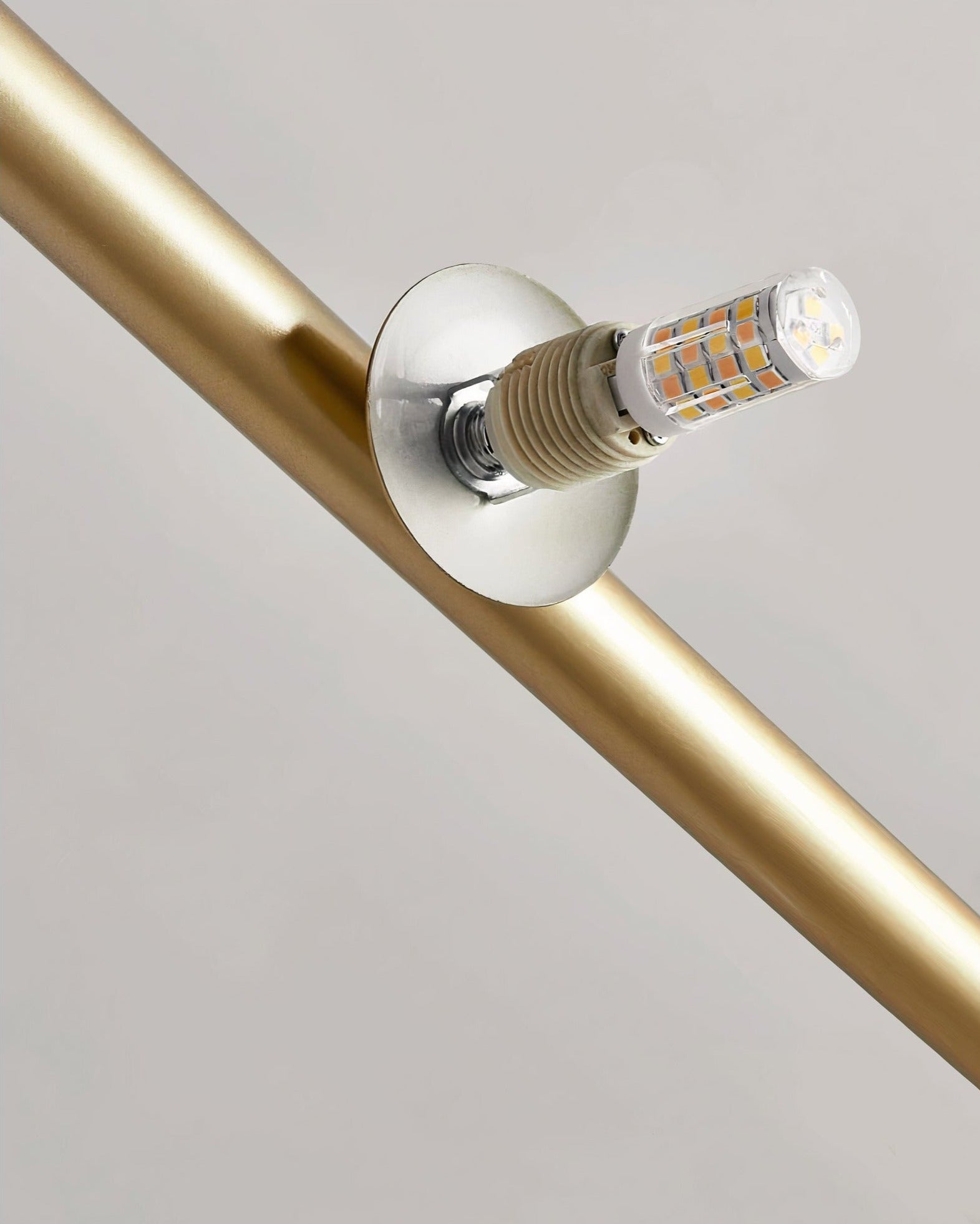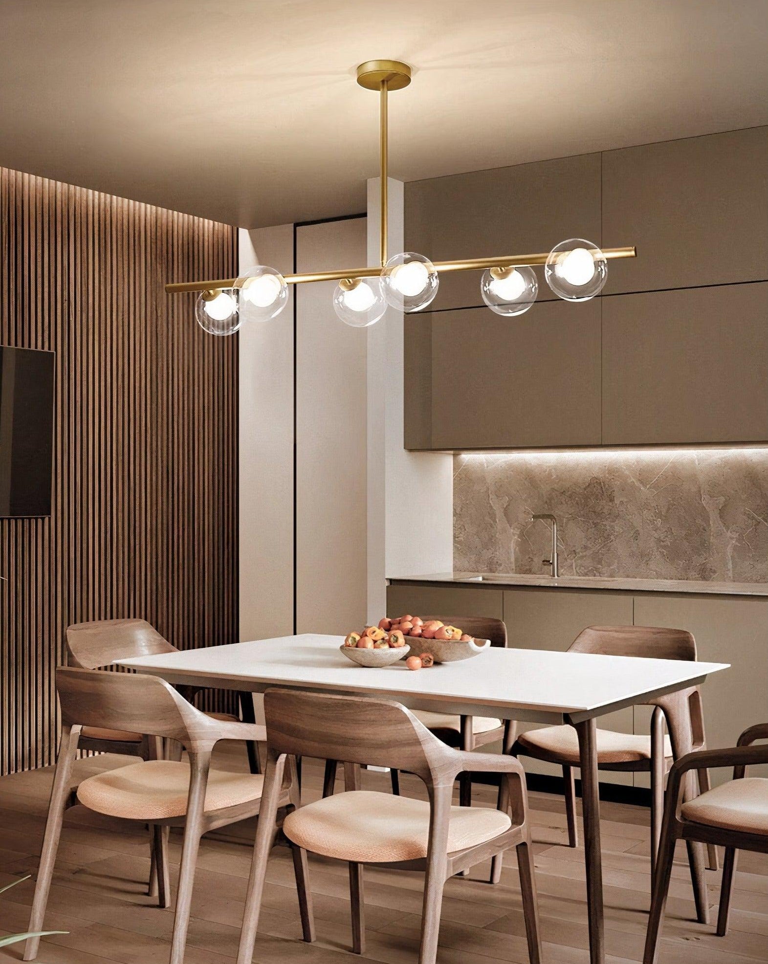The Briem chandelier, a Noho exclusive, features an iron bar that holds spherical, transparent bulb domes. This modern fixture is certain to bring a contemporary element to any space, providing bright light and a bold but simplistic approach to lighting decor. Available in black or gold, and with different lighting and size options.