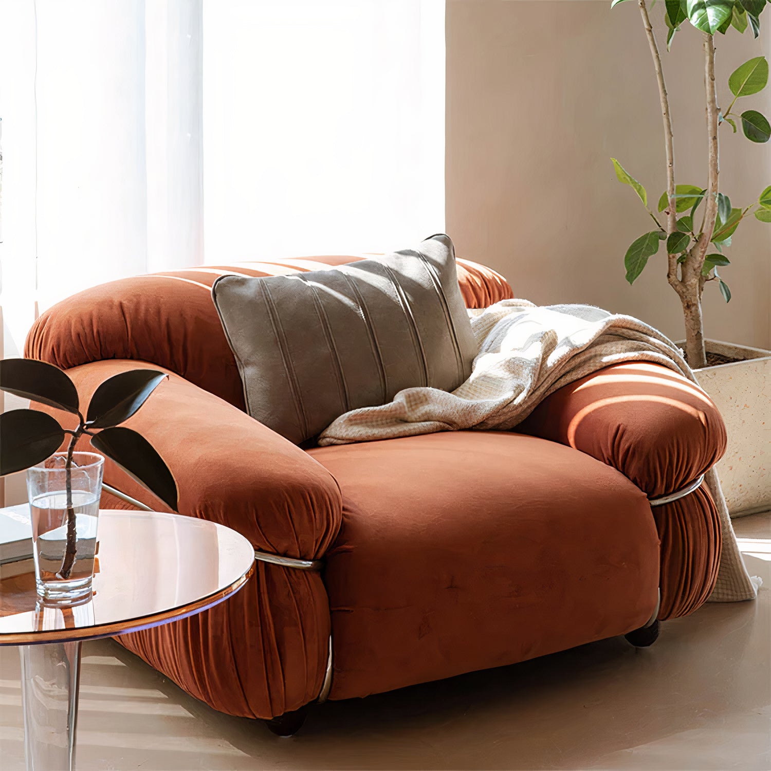 The Deiderik sofa set is a stunning collection of high density velvet suites, characterised by a contemporary stainless steel frame. Their ballooned bodies come in a soft off-white or a warm burnt orange, both perfect for sinking into after a long day.